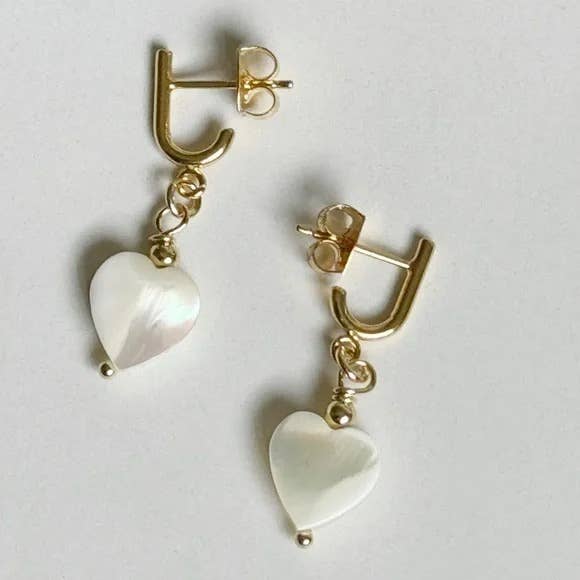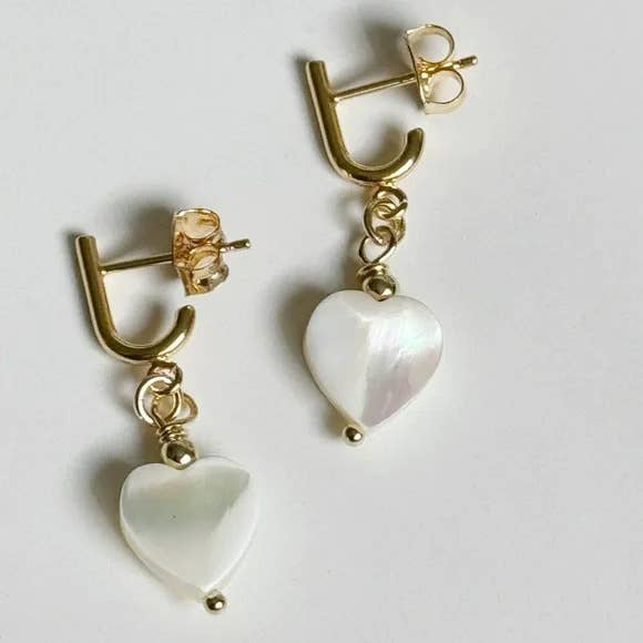 18K gold plated over brass J stud earrings featuring carved mother of pearl heart charms