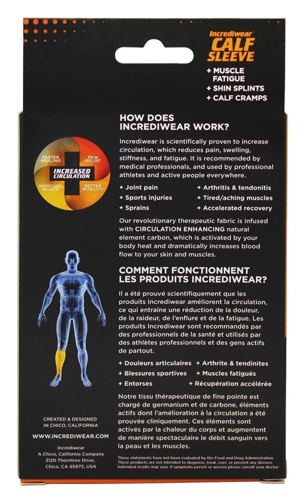 PRODUCT DESCRIPTION: For athletes looking to relieve pain and prevent injury of calf/shin related conditions or trauma, the Incrediwear Calf Sleeve provides ergonomic support to reduce muscle fatigue and enhance performance.