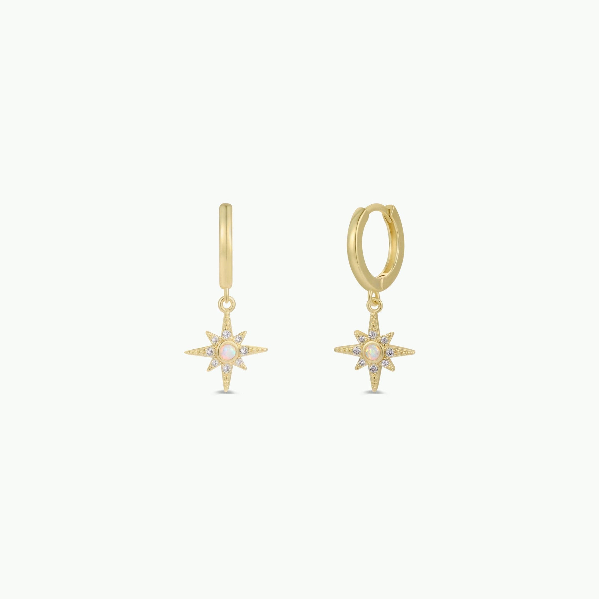 A gold hoop earring with a starburst charm featuring a ring of eight pave stones surrounding a white opal.