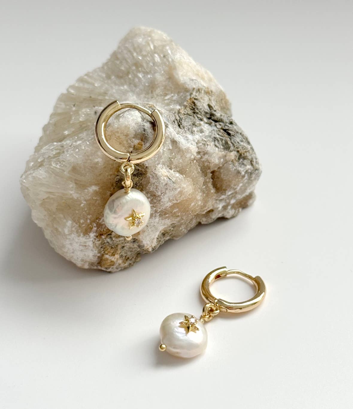 18K Gold Filled huggie hoop earrings featuring freshwater pearl charm embedded with small clear CZ stars