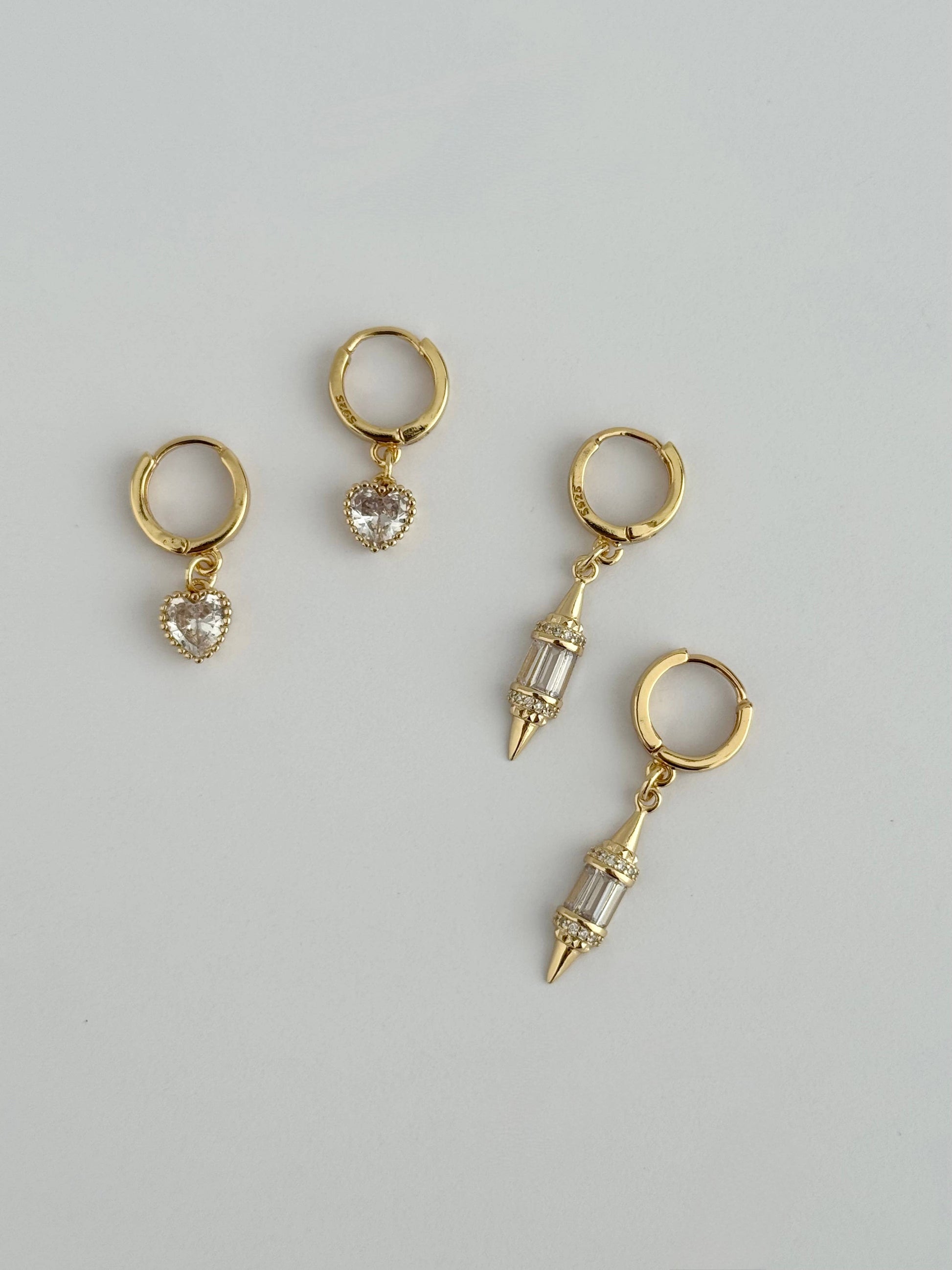 925 Sterling Silver Gold Vermeil Plated Huggies featuring dangling clear CZ heart charms
