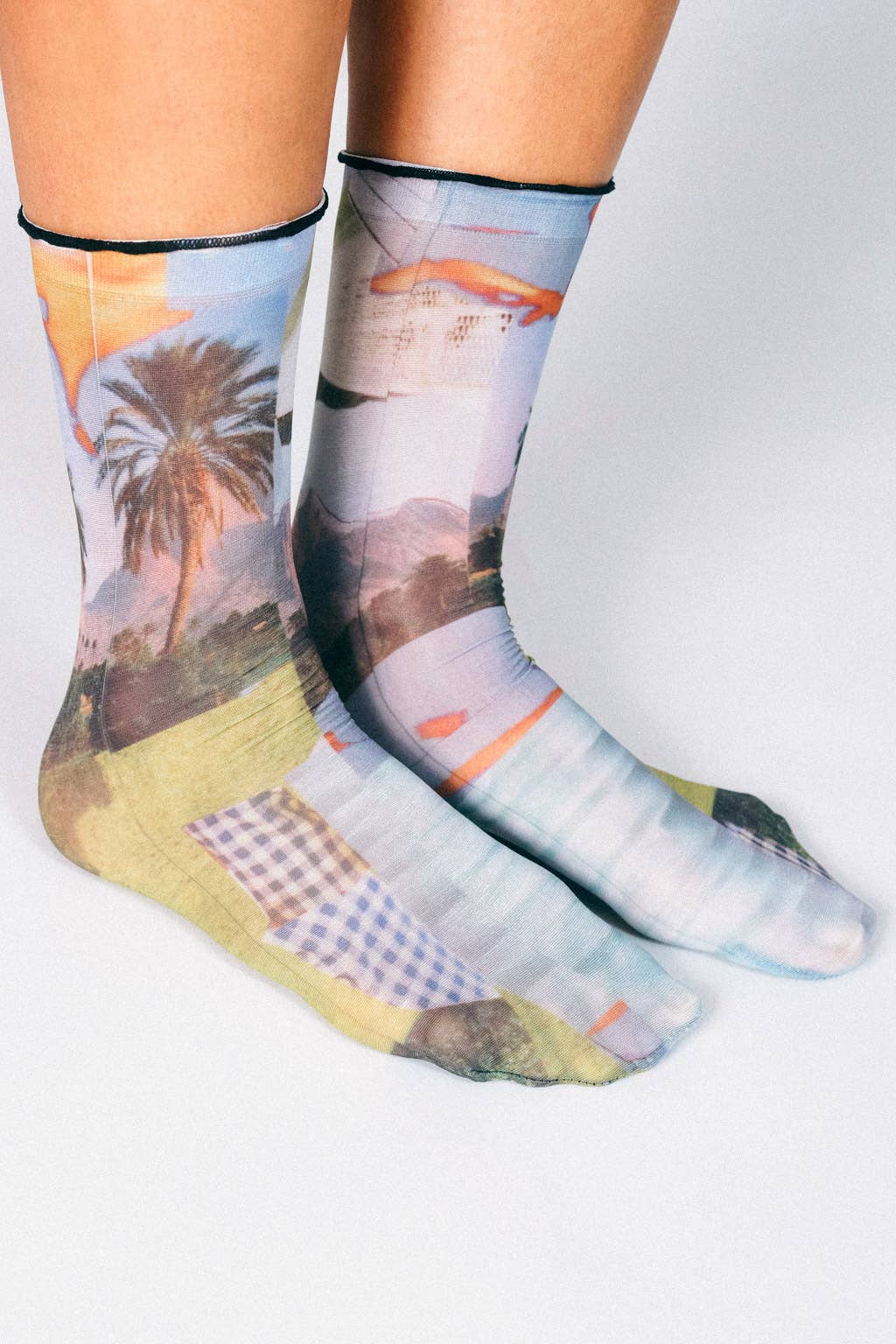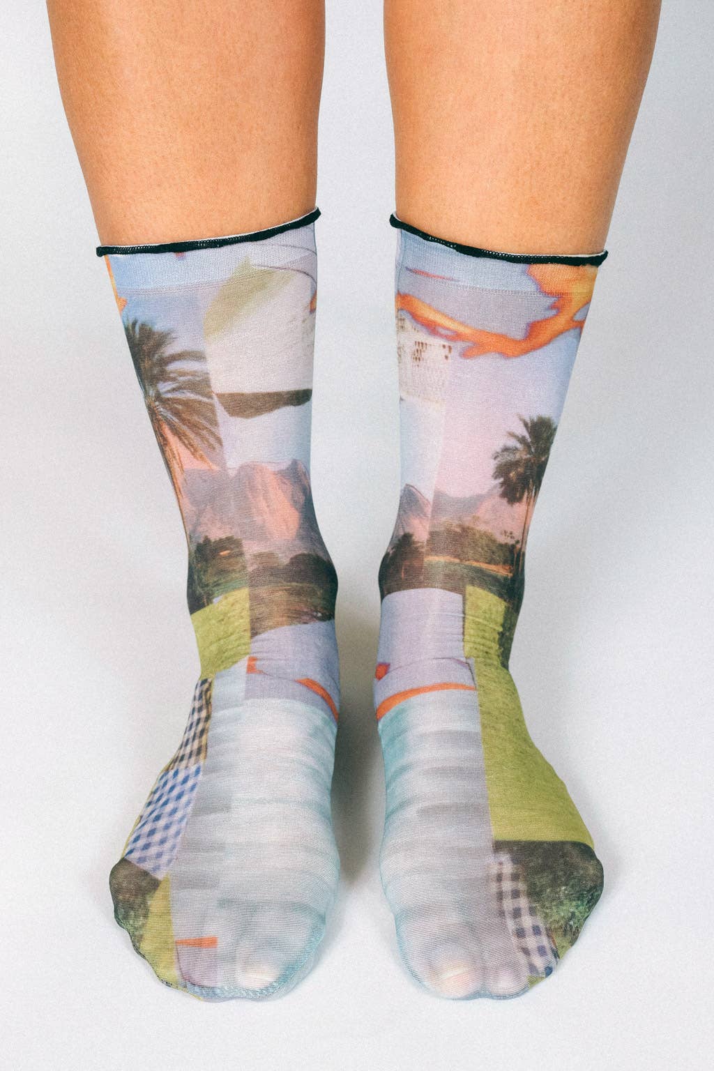 The By Rosie Barker Desert sock is a nylon tall-ankle design with a contrast black ruffle top cuff and printed with one of Rose's paper collage art pieces.