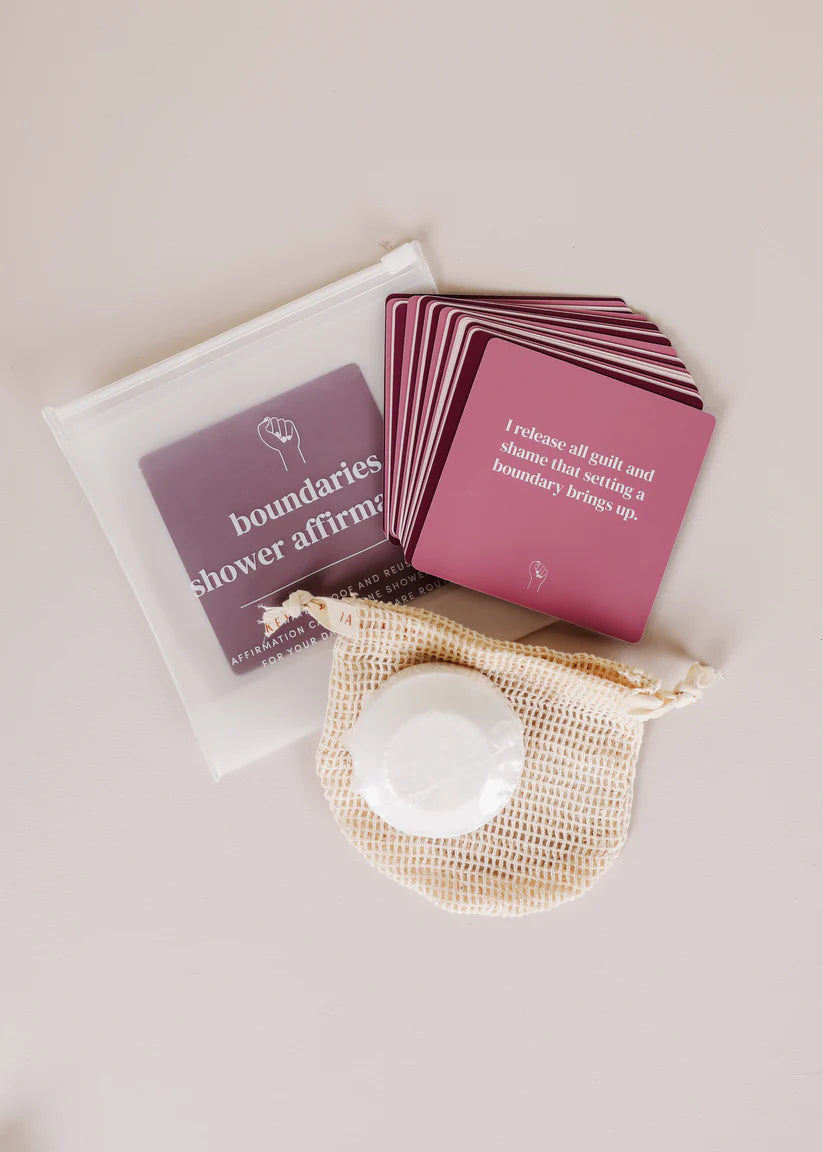 A new addition to our best-selling product. This gift set includes our all-new Boundaries Shower Affirmation Deck of 20 waterproof cards and a eucalyptus shower steamer.