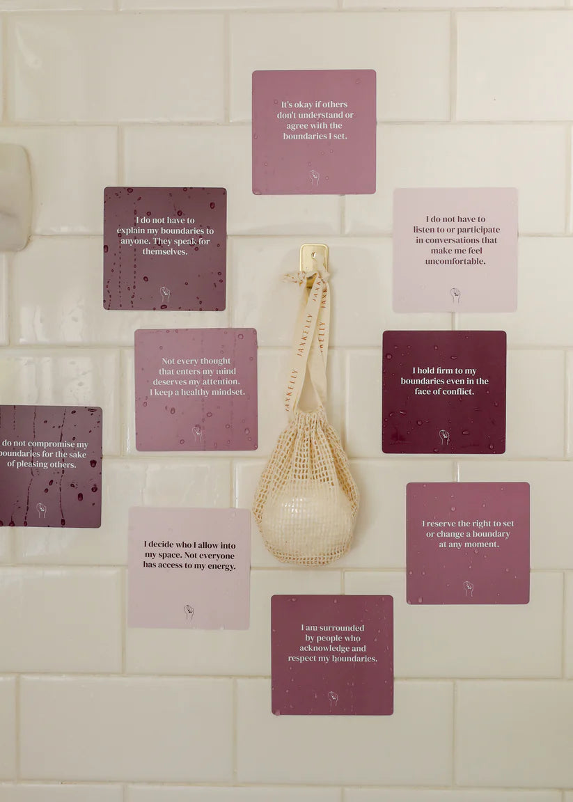 Includes unique quotes that help support healthy boundaries. Waterproof and reusable cards that grip easily on a wet surface, with no adhesives and no bleeding colors.