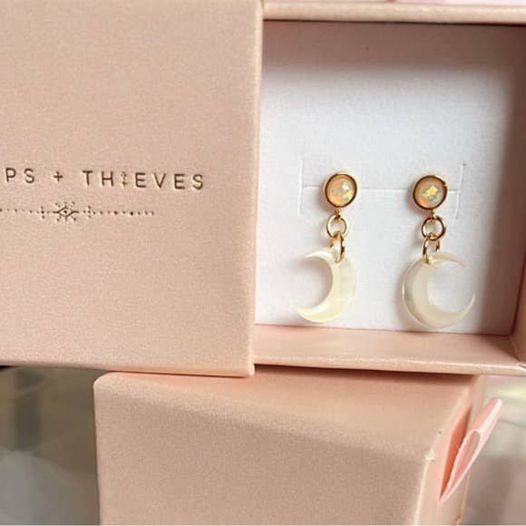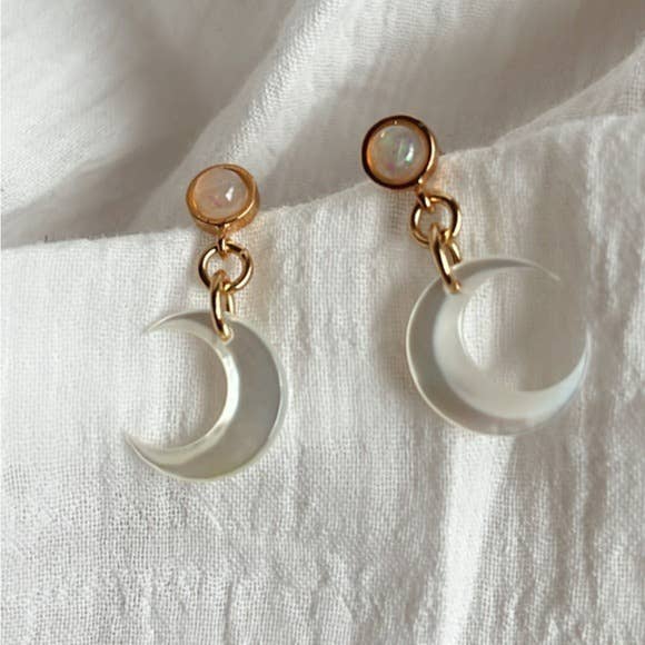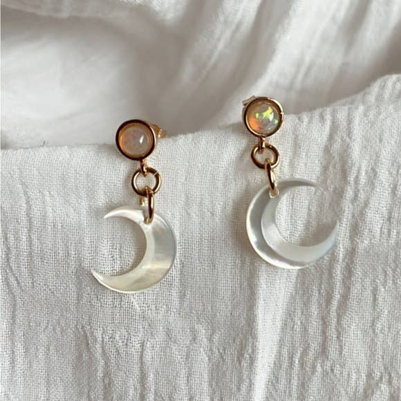 Dainty gold plated Opal stud earrings featuring carved mother of pearl moon charms