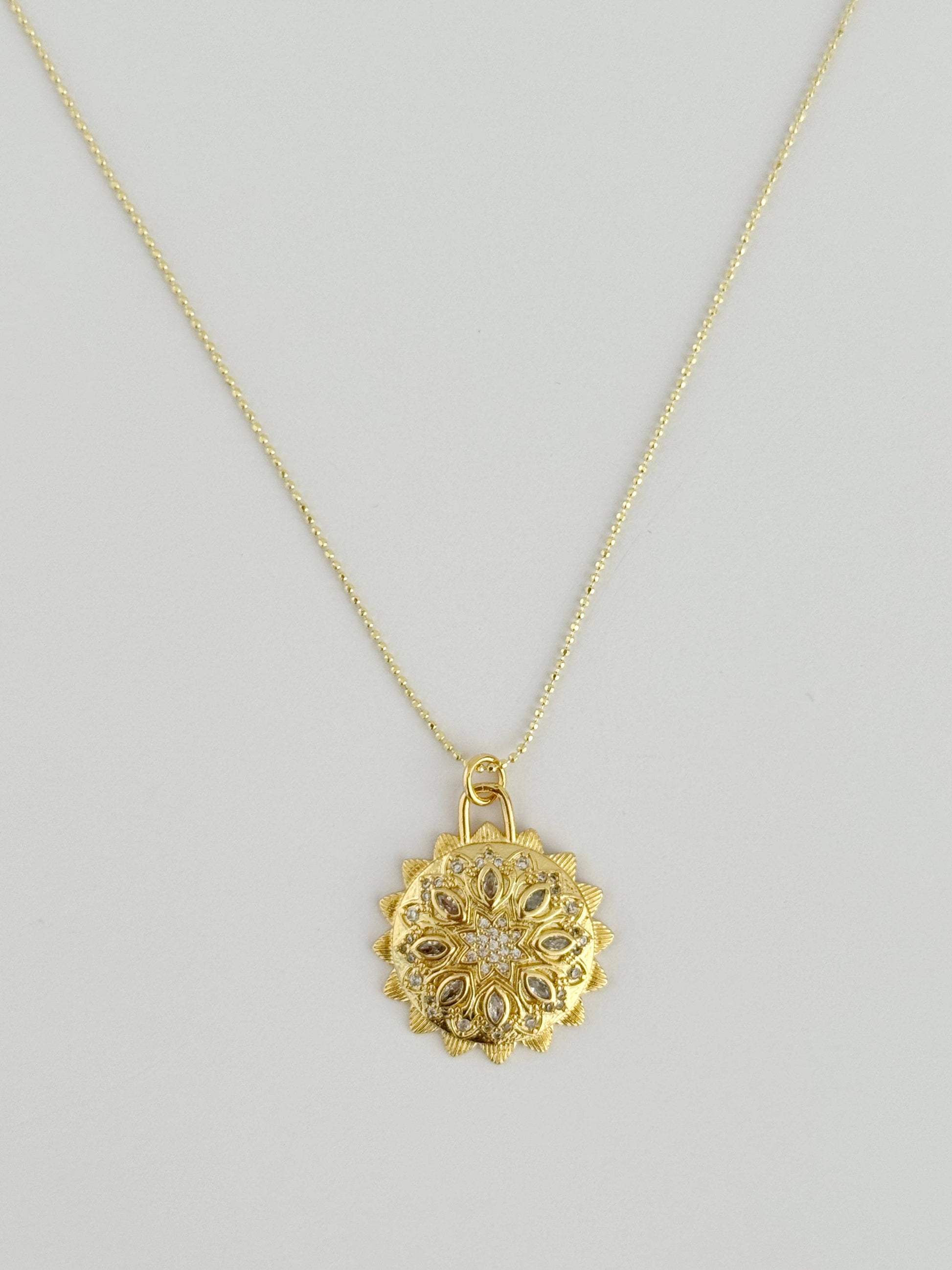 925 sterling gold vermeil plated dainty chain necklace featuring clear CZ embedded mandala pendent. The intricate design catches the light beautifully, making it an elegant and eye-catching accessory