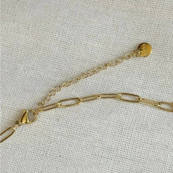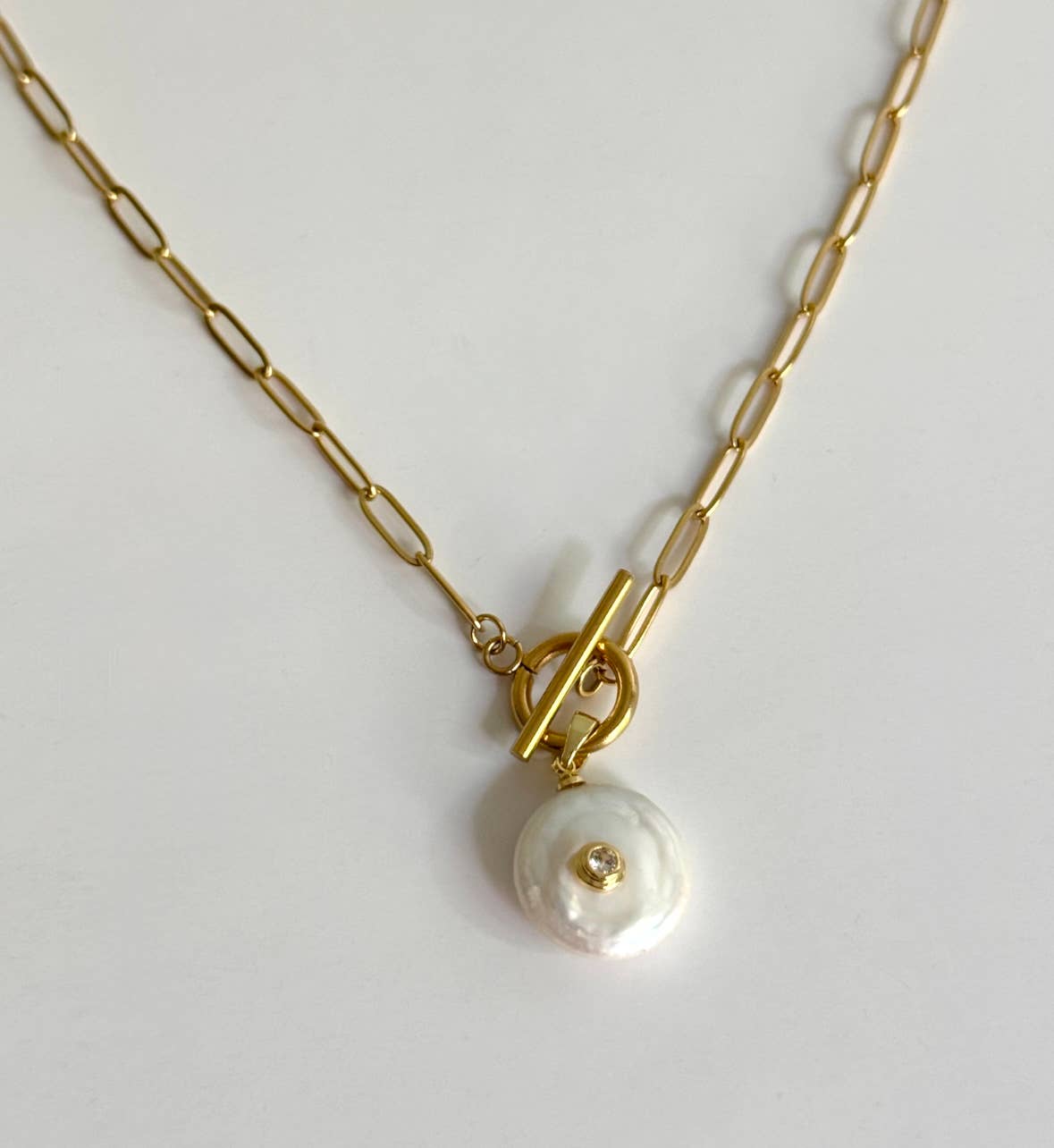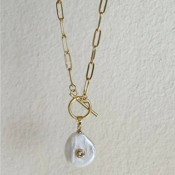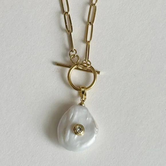 14K Gold Filled Paperclip Necklace featuring large freshwater pearl charm with clear Cz in center