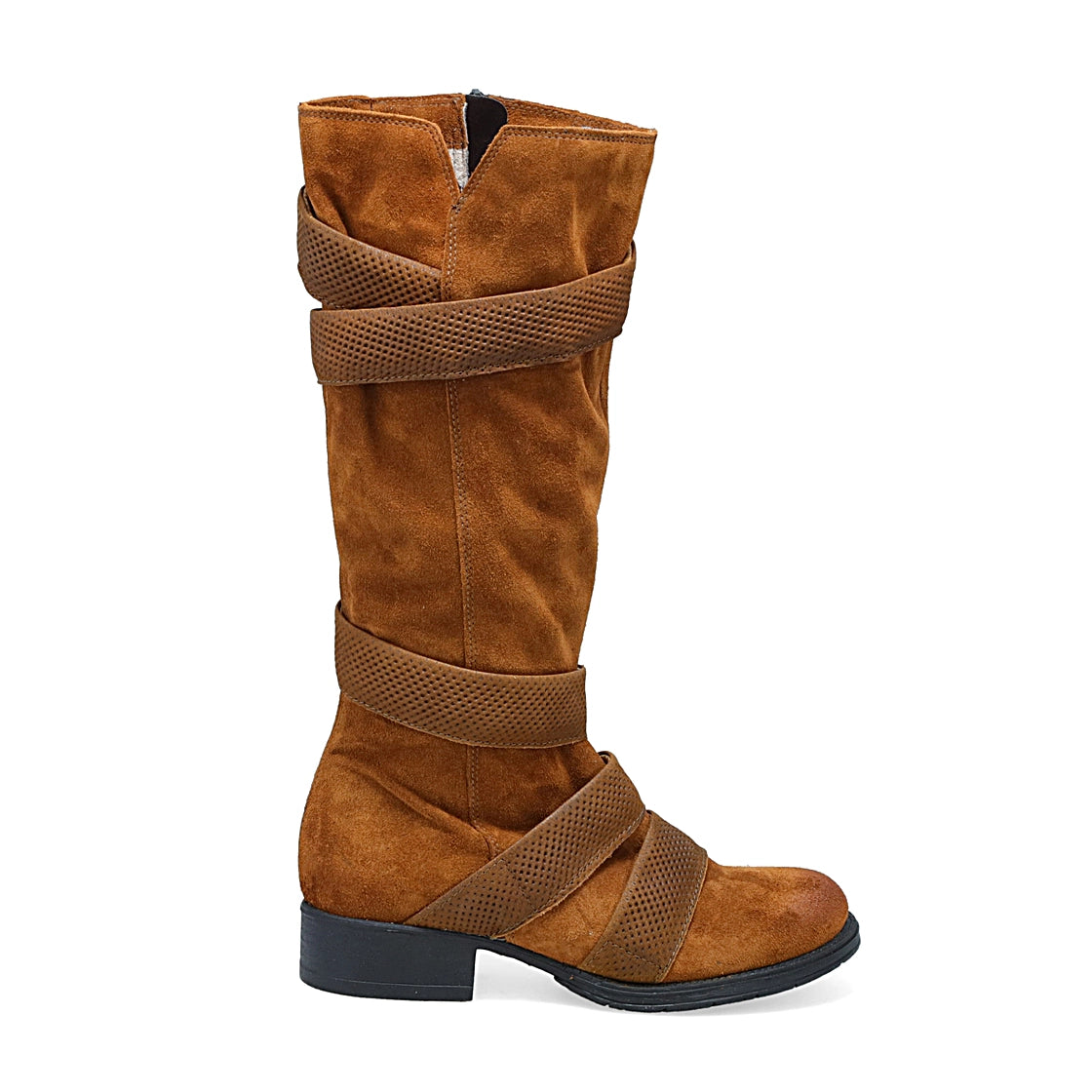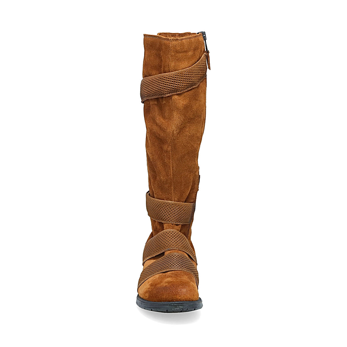 Decorative, perforated leather straps detailing this standard style riding boot, the Miz Mooz Noland will stand out amongst the crowd. Finished in soft suede, this boot has a full-length side zipper for effortless wear.