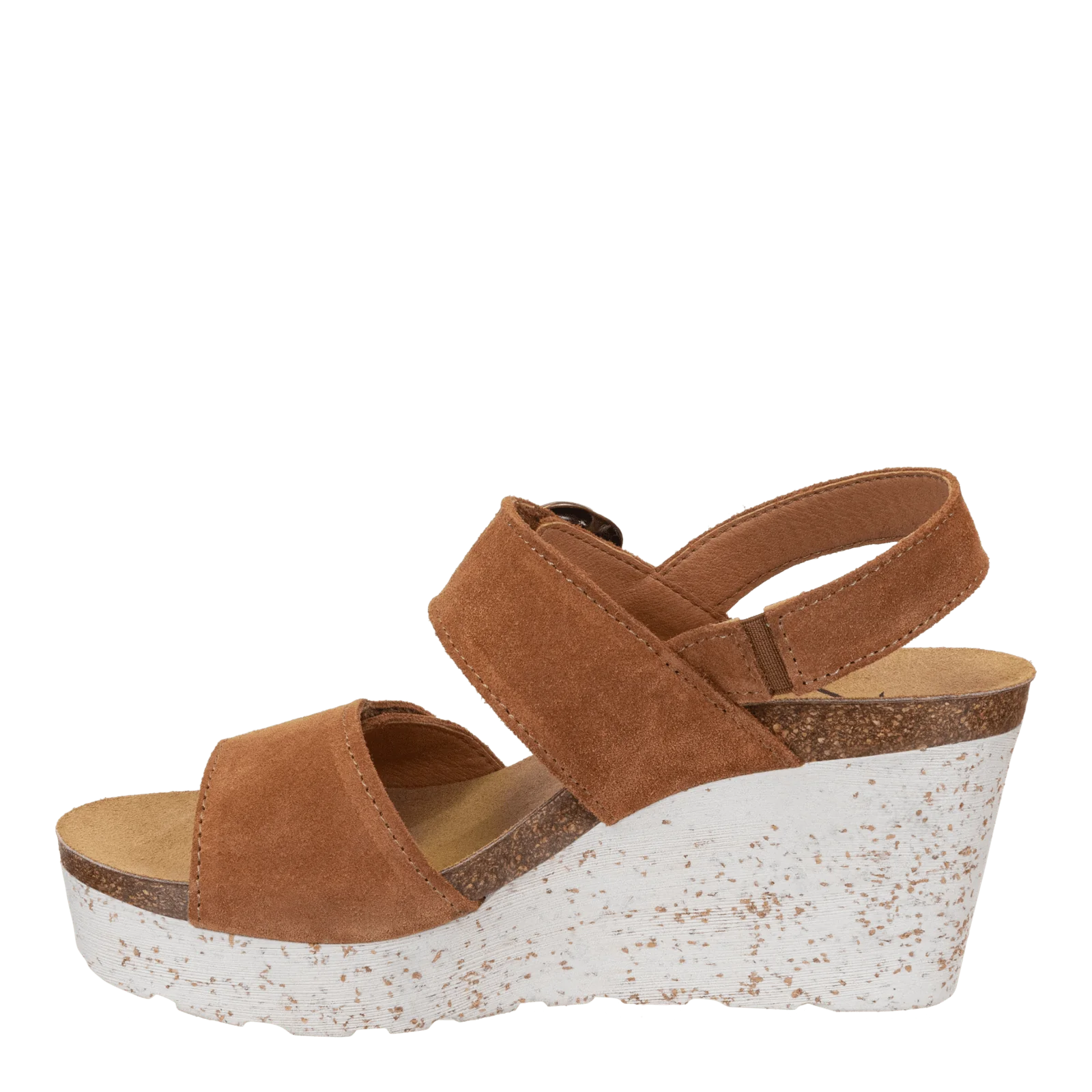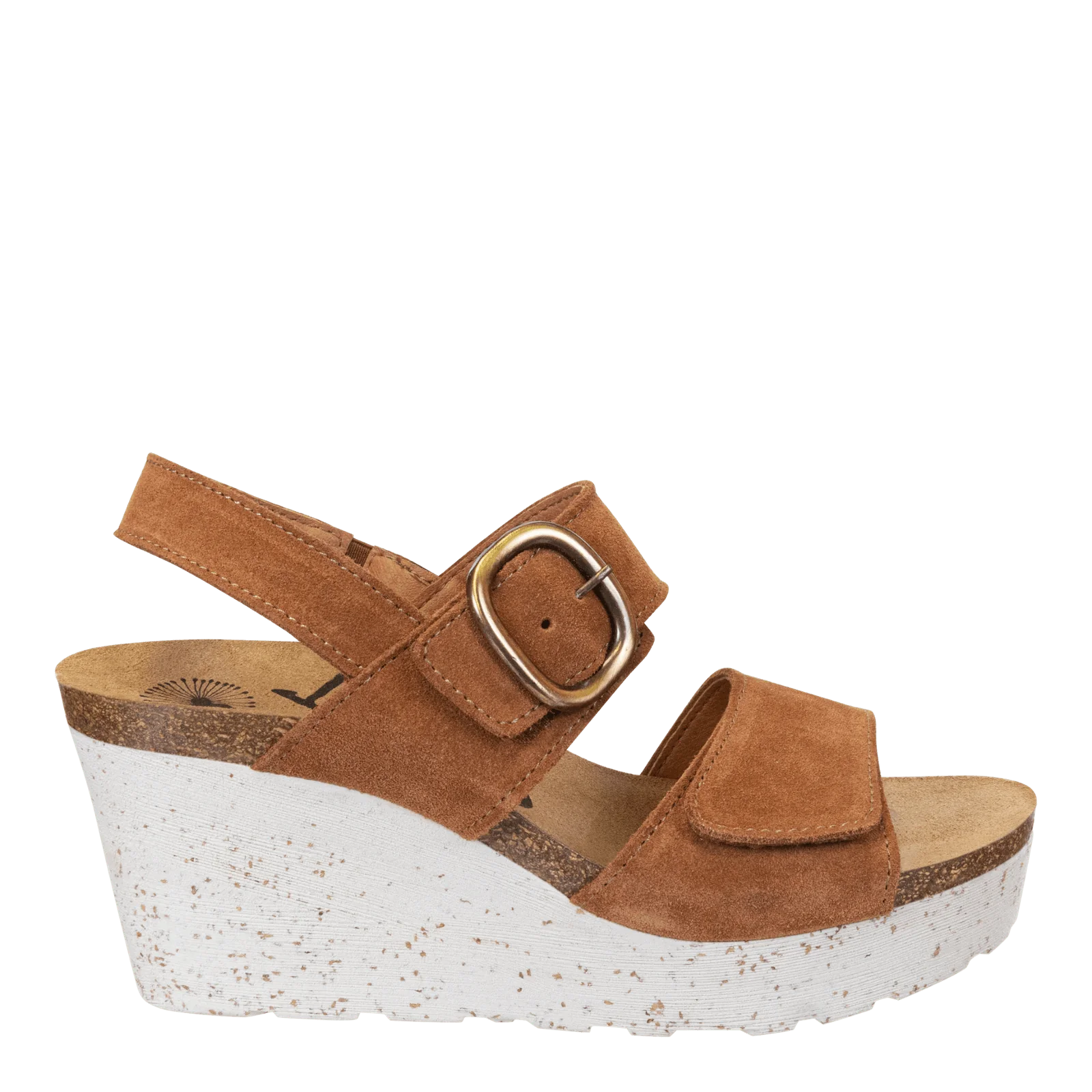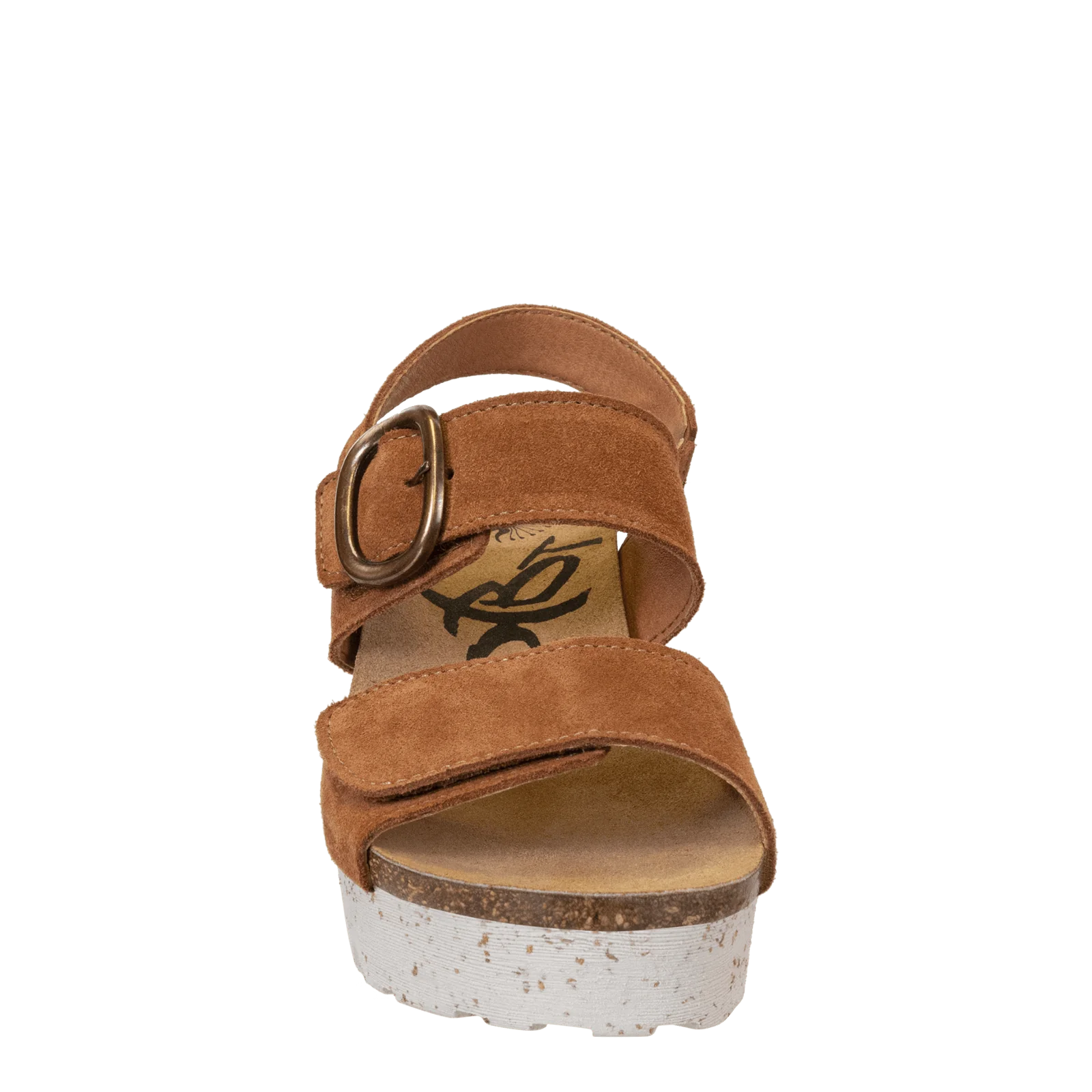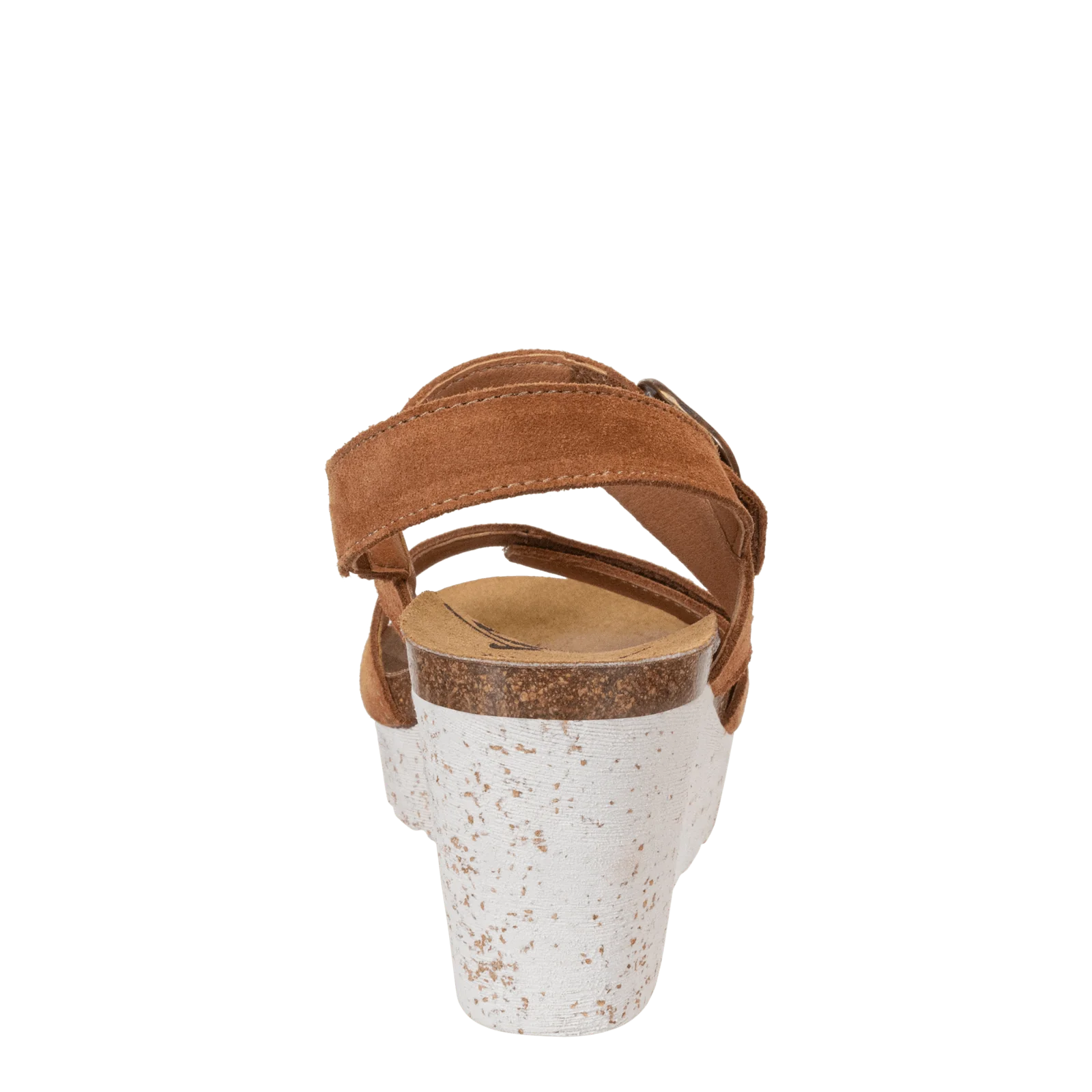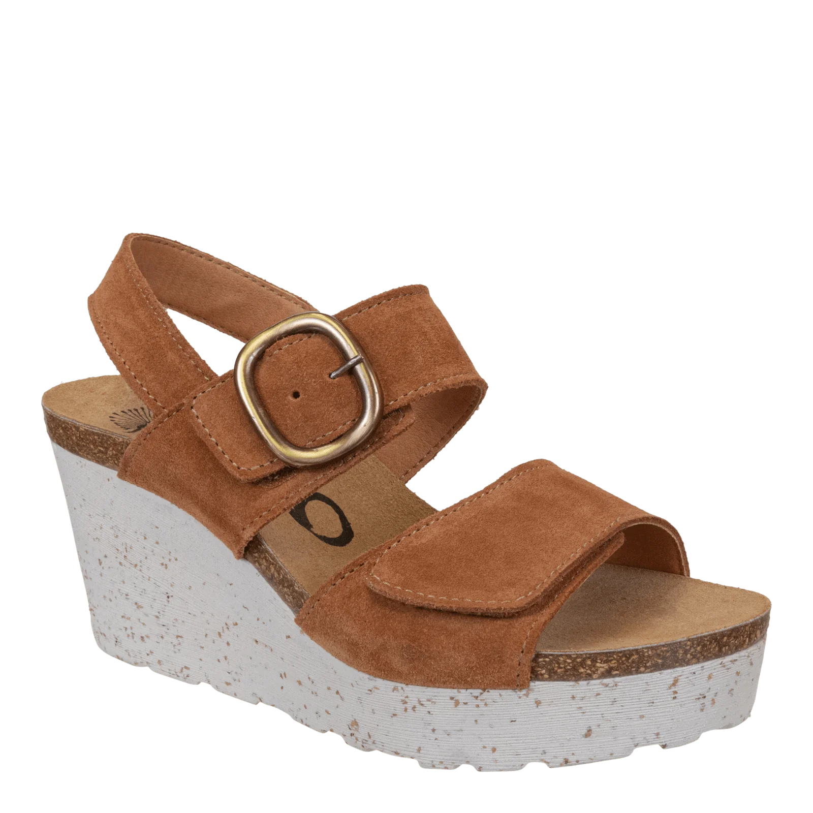 dorn yourself in OTBT's heritage boho style. Peasant in camel brown is the ultimate cottagecore wedge, handcrafted in Portugal with artisanal details. Featuring adjustable straps, a contoured footbed, and a grippy sole, it's made to take you places in all-day comfort. This brown wedge sandal is offset by a fresh white wedge, making it perfect to pair with everyday athleisure basics or your boutique favorites.