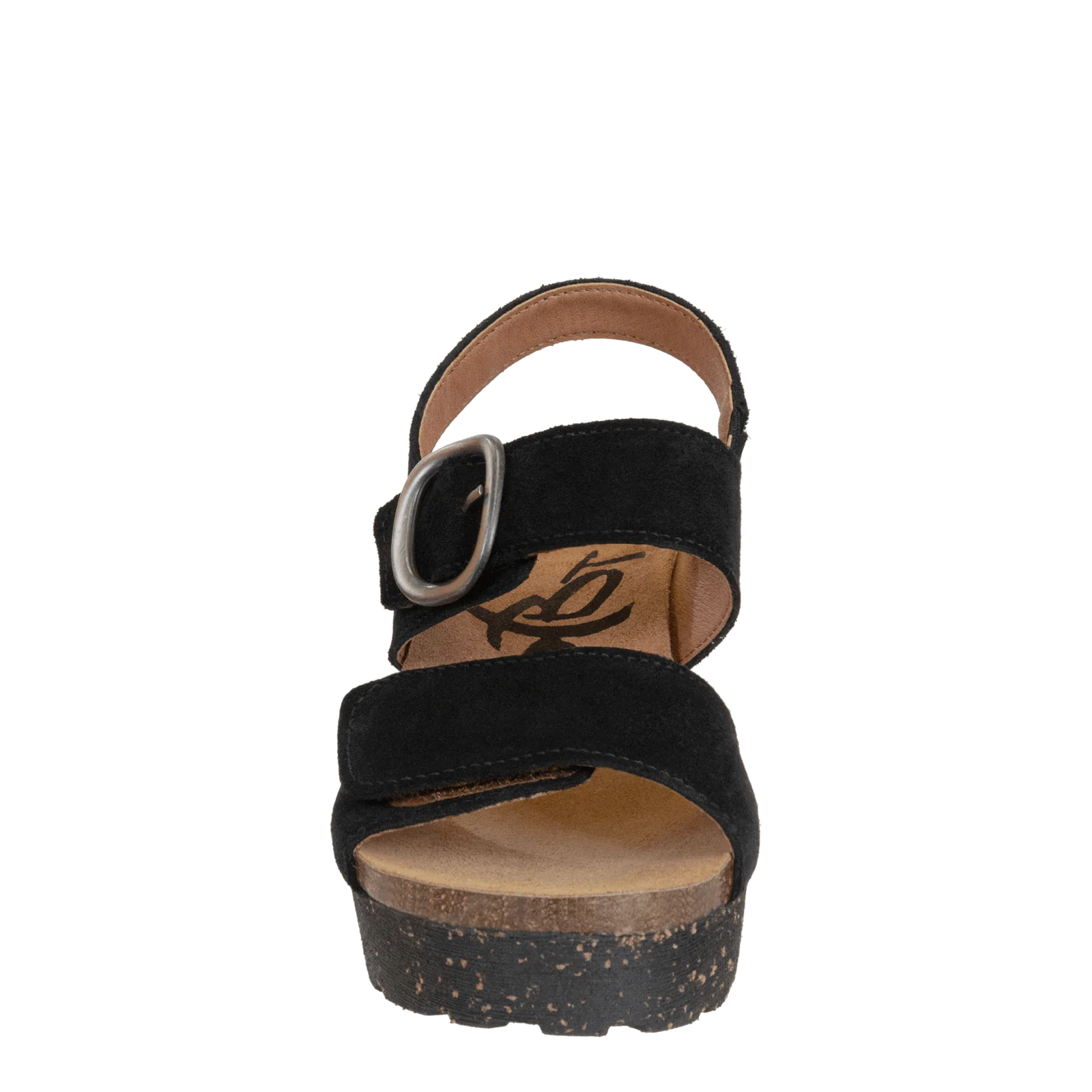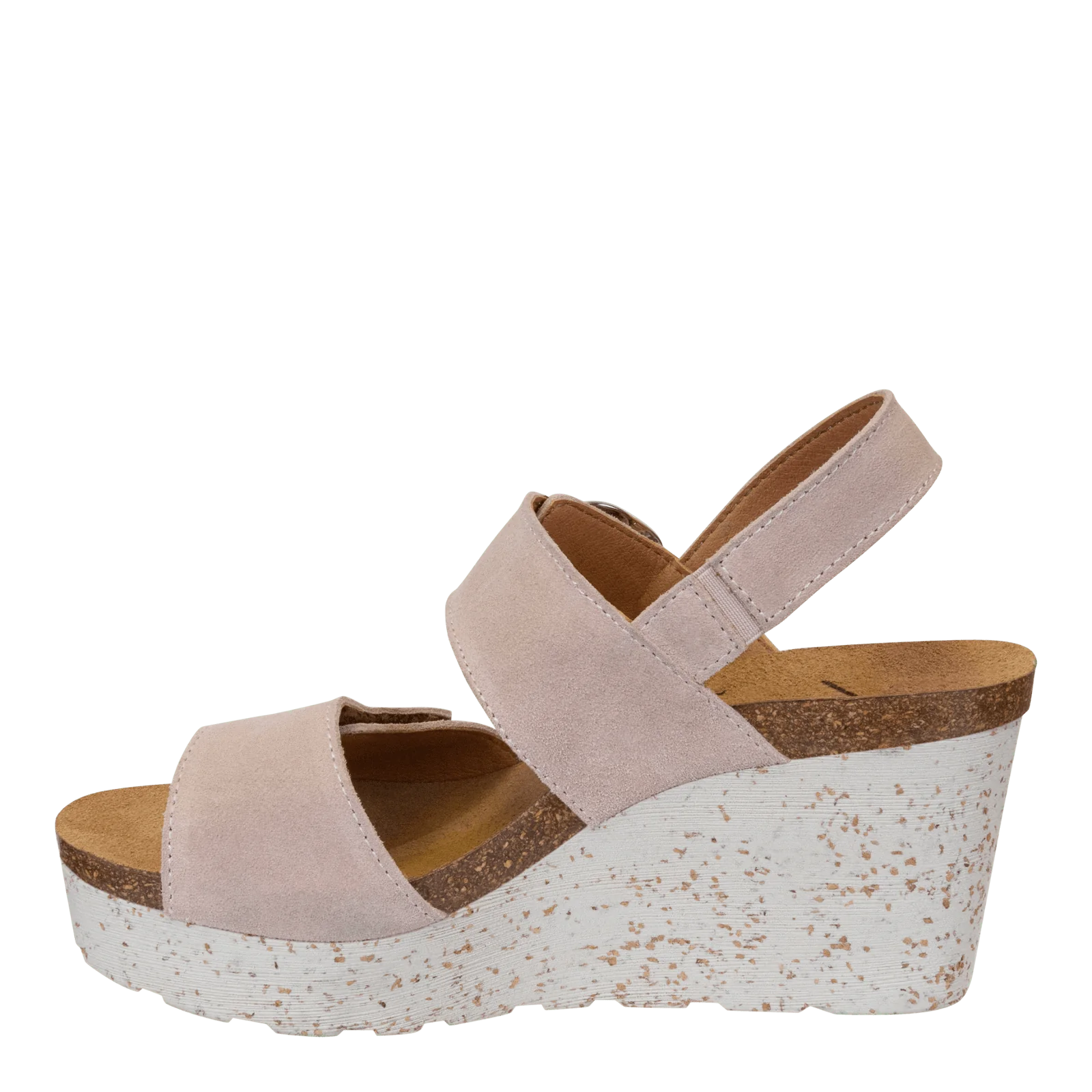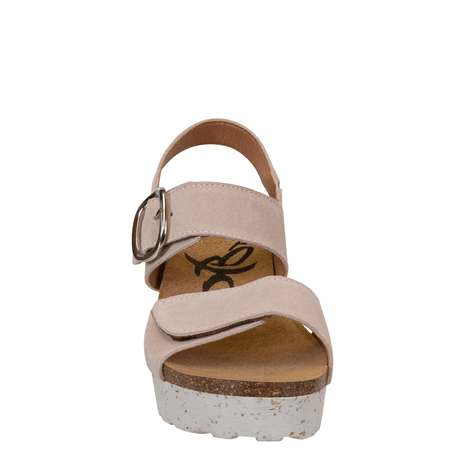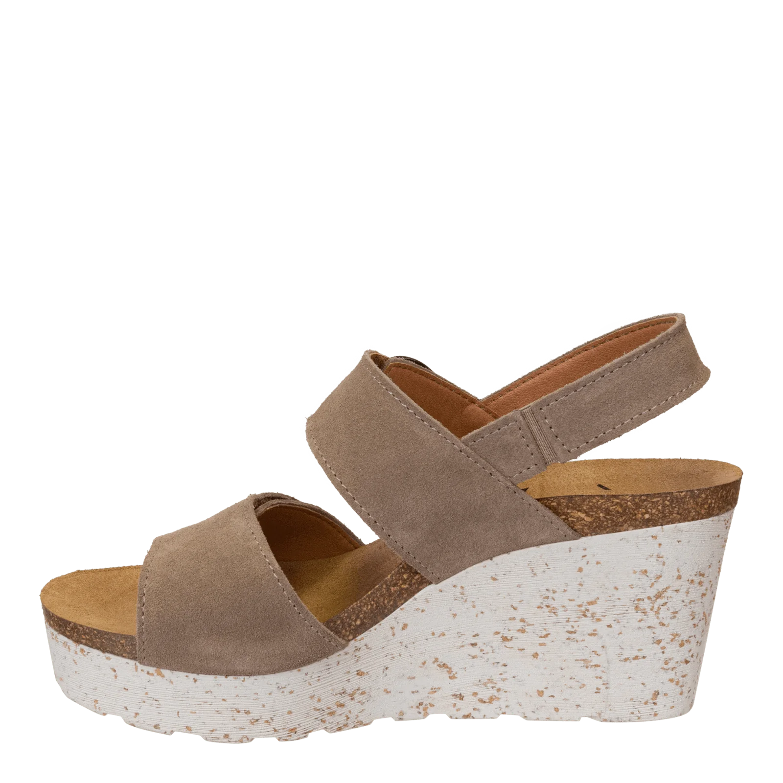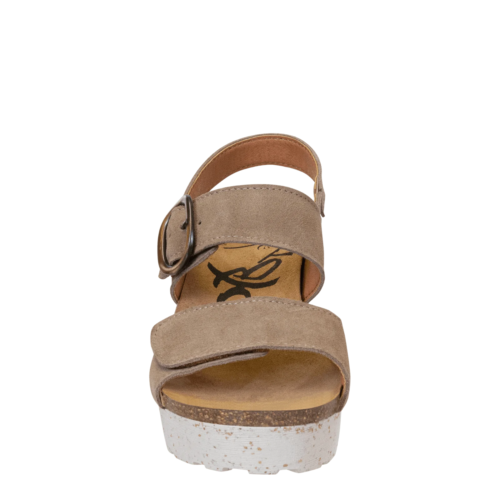 dorn yourself in OTBT's heritage boho style. Peasant in camel brown is the ultimate cottagecore wedge, handcrafted in Portugal with artisanal details. Featuring adjustable straps, a contoured footbed, and a grippy sole, it's made to take you places in all-day comfort. This brown wedge sandal is offset by a fresh white wedge, making it perfect to pair with everyday athleisure basics or your boutique favorites.