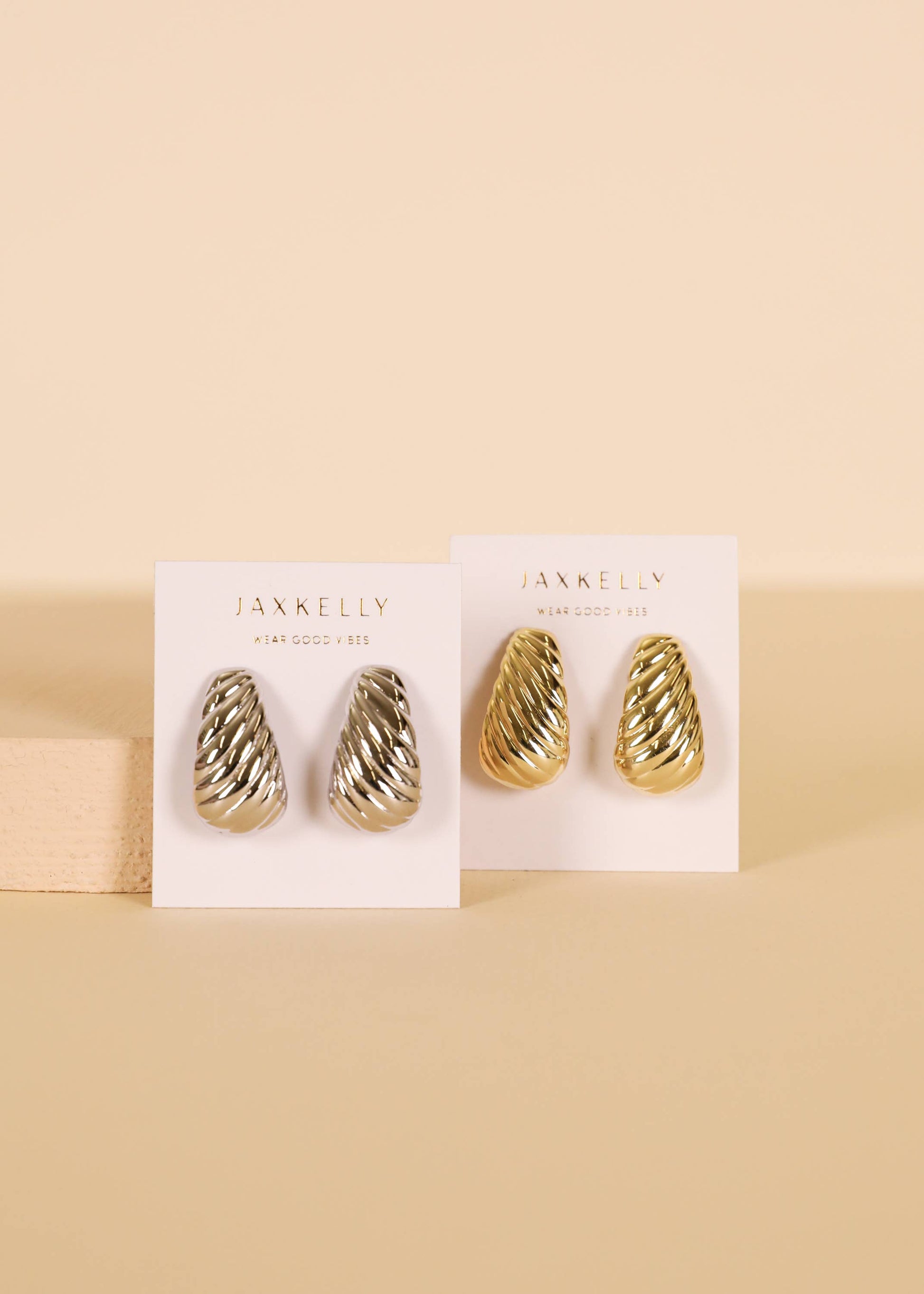This statement hoop earring features distinct ridges, and a bold fluted drop.