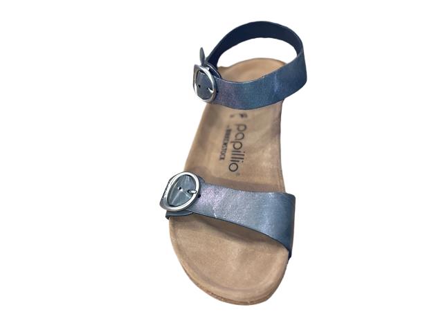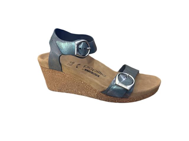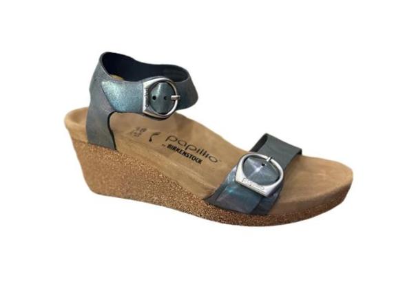From Papillio® by BIRKENSTOCK®. The Soley wedge levels up with comfort and ease, catching eyes as it goes. Metallic leather straps flash across the foot, brought together by shiny, rounded buckles. Lifted by a classic cork wedge, built around the contoured footbed you love.