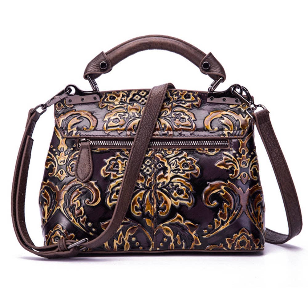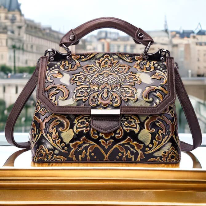 The Modenaire bag is detailed with vintage embossed design. Features two tone, solid color, top handle, extra long straps, and leather material bag.