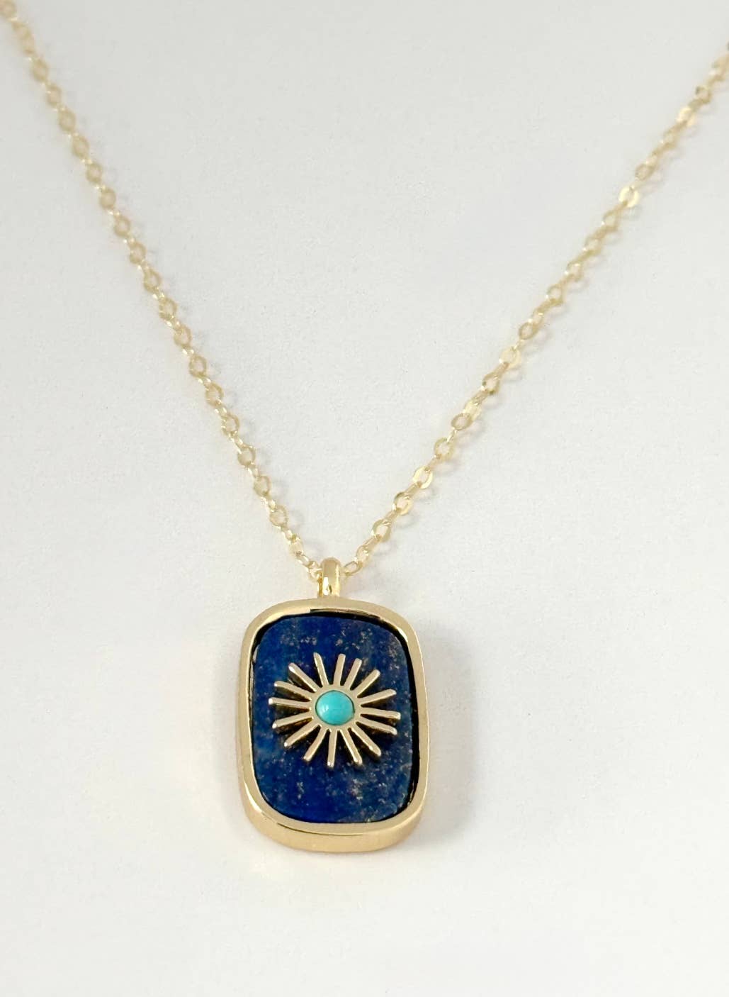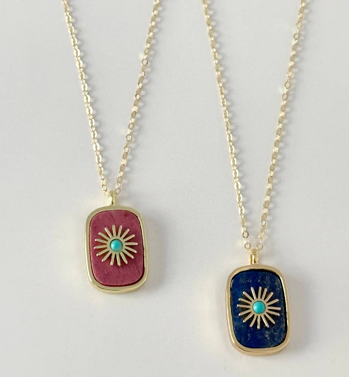 925 sterling gold vermeil plated dainty chain featuring a sun medallion made of Lapis or Rhodochrosite with Turquoise gemstone in center